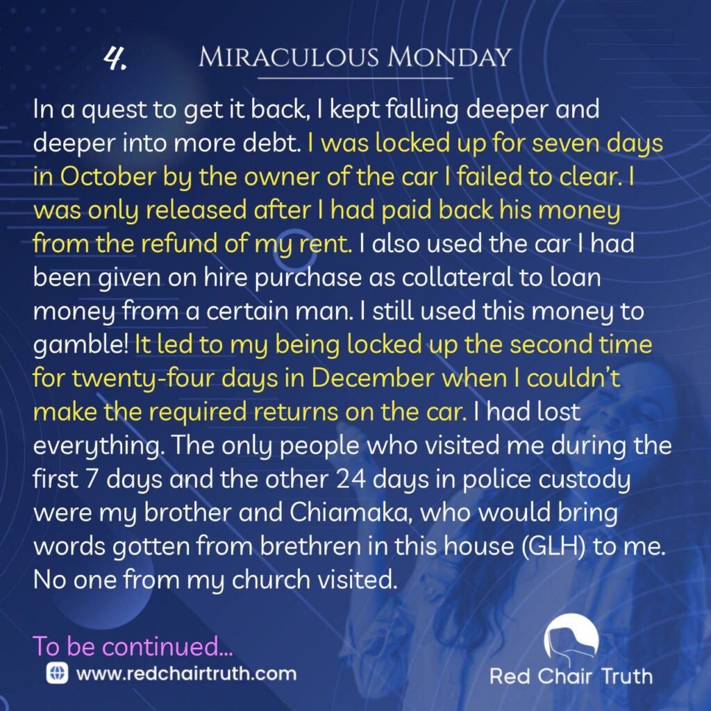 In a quest to get it back, I kept falling deeper and deeper into more debt. I was locked up for seven days in October by the owner of the car I failed to clear. I was only released after I had paid back his money from the refund of my rent. I also used the car I had been given on hire purchase as collateral to loan money from a certain man. I still used this money to gamble! It led to my being locked up the second time for twenty-four days in December when I couldn’t make the required returns on the car. I had lost everything. The only people who visited me during the first 7 days and the other 24 days in police custody were my brother and Chiamaka, who would bring words gotten from brethren in this house (GLH) to me. No one from my church visited.