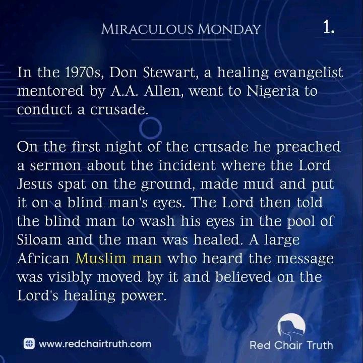 In the 1970s, Don Stewart, a healing evangelist mentored by A.A. Allen, went to Nigeria to conduct a crusade. On the first night of the crusade, he preached a sermon about the incident where the Lord Jesus spat on the ground, made mud, and put it on a blind man’s eyes. The Lord then told the blind man to wash his eyes in the pool of Siloam, and the man was healed.