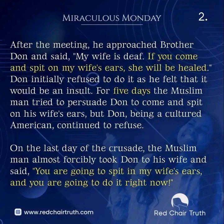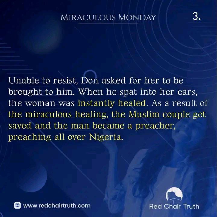 Unable to resist, Don asked for her to be brought to him. When he spat into her ears, the woman was instantly healed. As a result of the miraculous healing, the Muslim couple got saved, and the man became a preacher, spreading the Gospel all over Nigeria.