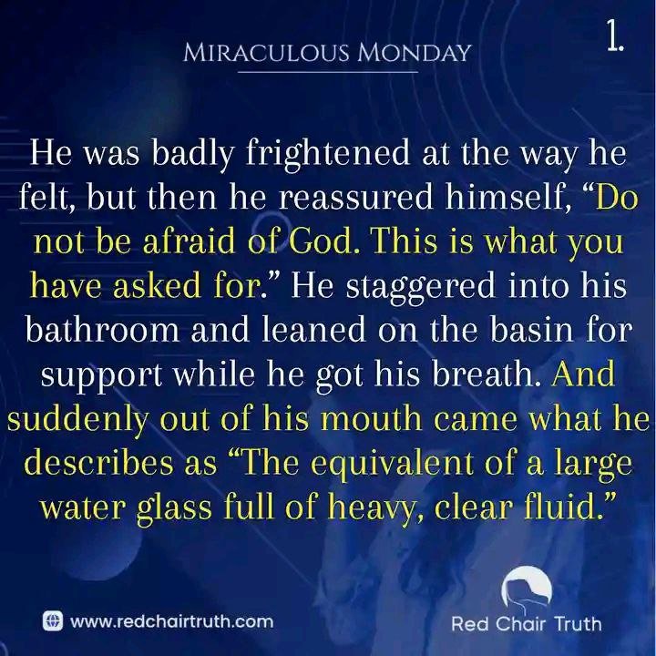 He was badly frightened at the way he felt, but then he reassured himself, “Do not be afraid of God. This is what you have asked for.” He staggered into his bathroom and leaned on the basin for support while he got his breath. And suddenly out of his mouth came what he describes as “The equivalent of a large water glass full of heavy, clear fluid.”