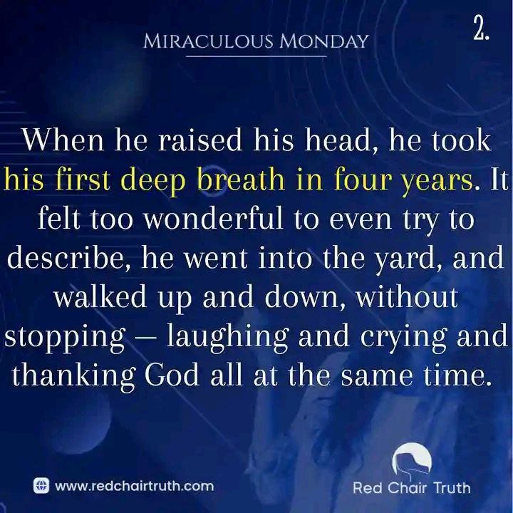 When he raised his head, he took his first deep breath in four years. It felt too wonderful to even try to describe, he went into the yard, and walked up and down, without stopping—laughing and crying and thanking God all at the same time.