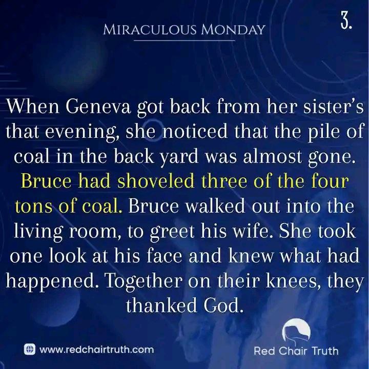 When Geneva got back from her sister’s that evening, she noticed that the pile of coal in the back yard was almost gone. Bruce had shoveled three of the four tons of coal. Bruce walked out into the living room, to greet his wife. She took one look at his face and knew what had happened. Together on their knees, they thanked God.