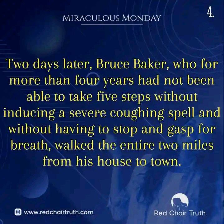 Two days later, Bruce Baker, who for more than four years had not been able to take five steps without inducing a severe coughing spell and without having to stop and gasp for breath, walked the entire two miles from his house to town.