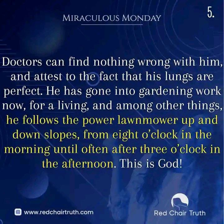 Doctors can find nothing wrong with him, and attest to the fact that his lungs are perfect. He has gone into gardening work now, for a living, and among other things, he follows the power lawnmower up and down slopes, from eight o’clock in the morning until often after three o’clock in the afternoon. This is God!
