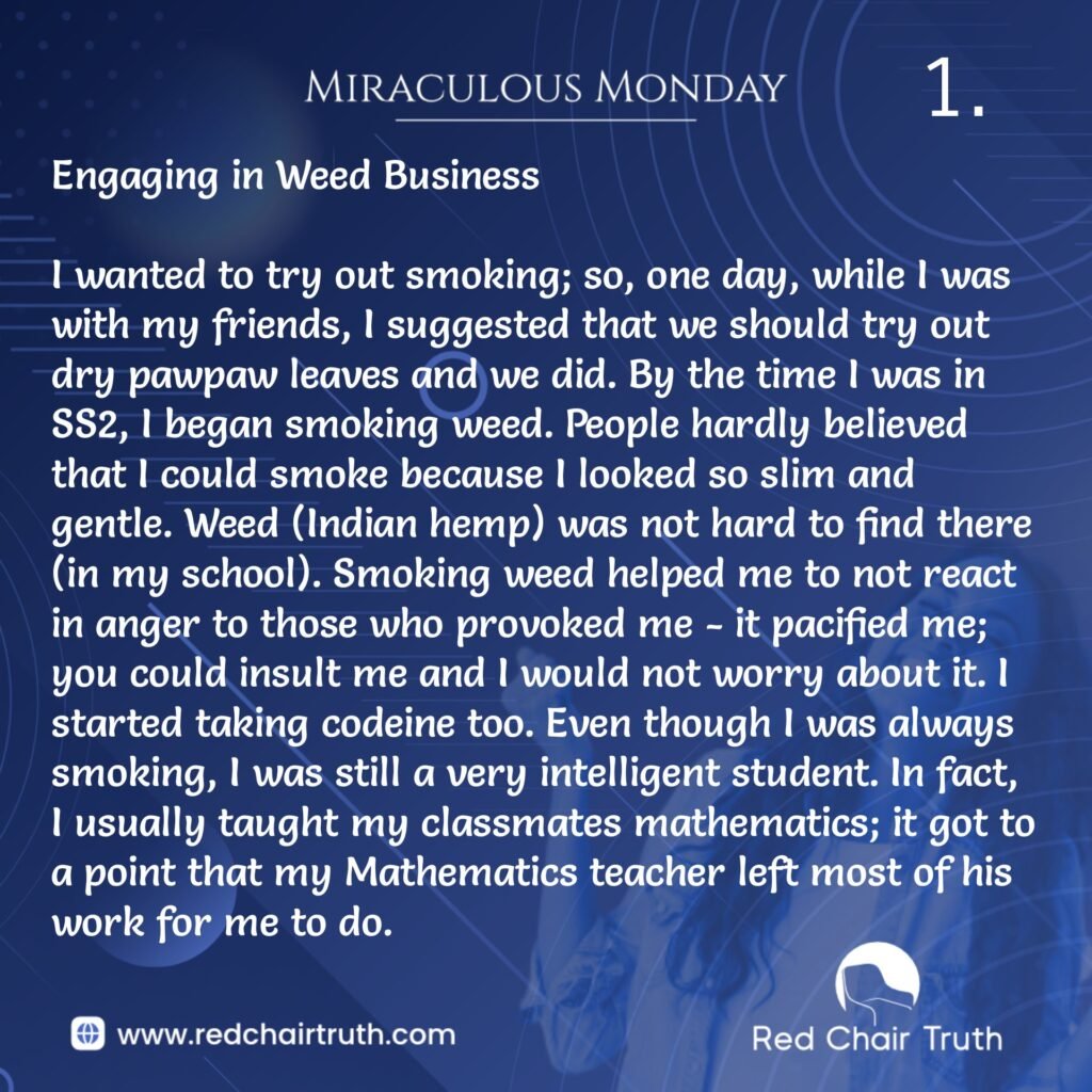 During this period too, I was a church goer. Sometimes, I would come back from church feeling convicted about the kind of lifestyle I was living. Whenever I tried to tell my friends I wanted to stop doing those things, they would counter everything I said with Scriptures, applying them wrongly, of course. They usually liked quoting Genesis 1:29 that says that God has given all the grasses of the field to man for food. To them, weed was included. I was ignorant and did not know how to interpret scriptures so I believed it.