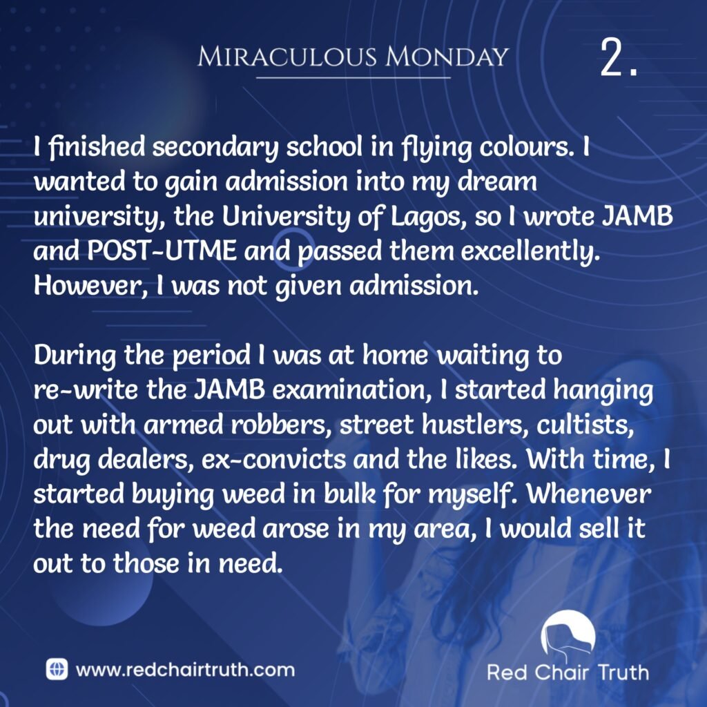 I finished secondary school in flying colours. I wanted to gain admission into my dream university, the University of Lagos, so I wrote JAMB and POST-UTME and passed them excellently. However, I was not given admission.