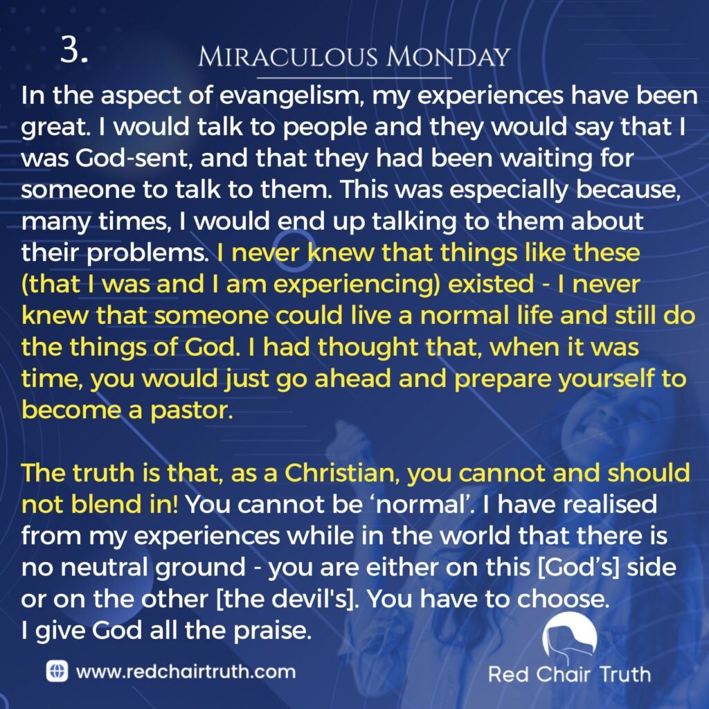 The truth is that, as a Christian, you cannot and should not blend in! You cannot be ‘normal’. I have realised from my experiences while in the world that there is no neutral ground – you are either on this [God’s] side or on the other [the devil’s]. You have to choose. I give God all the praise.