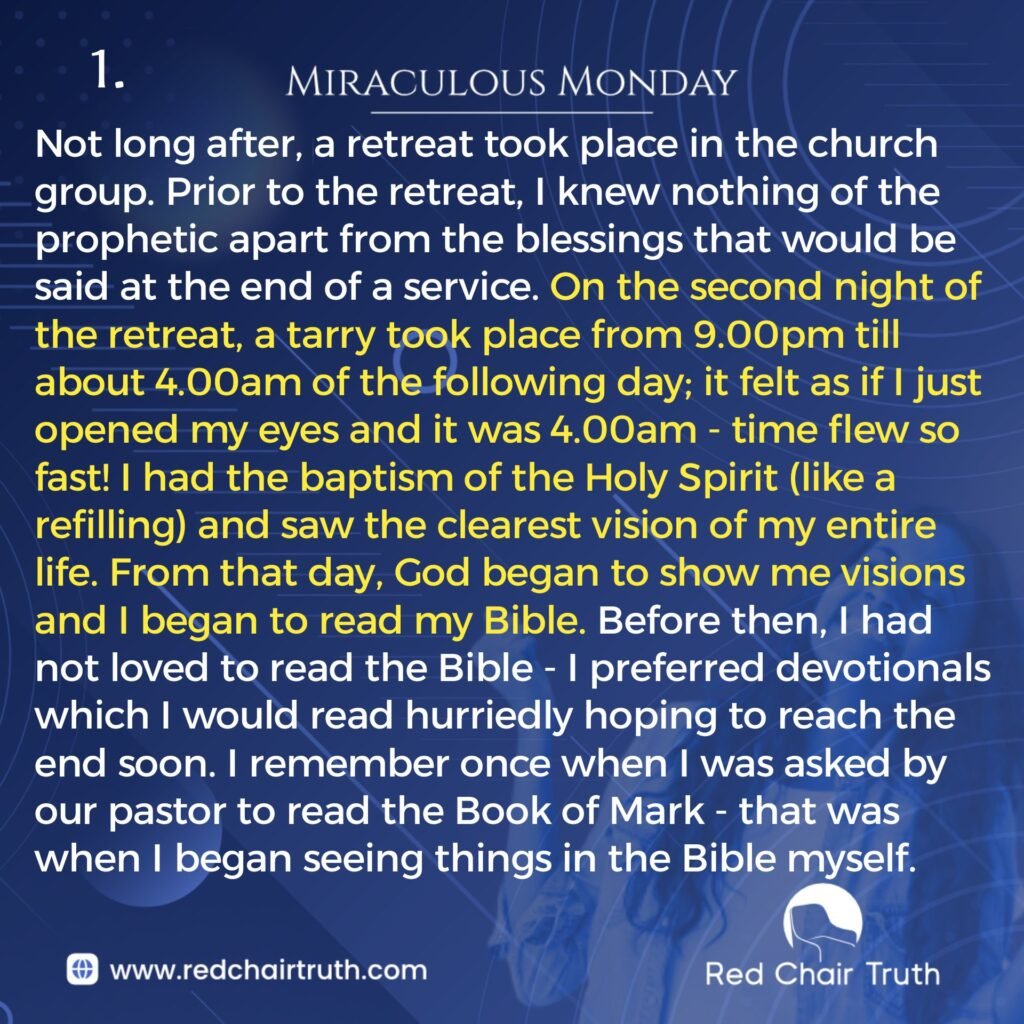 Not long after, a retreat took place in the church group. Prior to the retreat, I knew nothing of the prophetic apart from the blessings that would be said at the end of a service. On the second night of the retreat, a tarry took place from 9.00pm till about 4.00am of the following day; it felt as if I just opened my eyes and it was 4.00am – time flew so fast! I had the baptism of the Holy Spirit (like a refilling) and saw the clearest vision of my entire life.