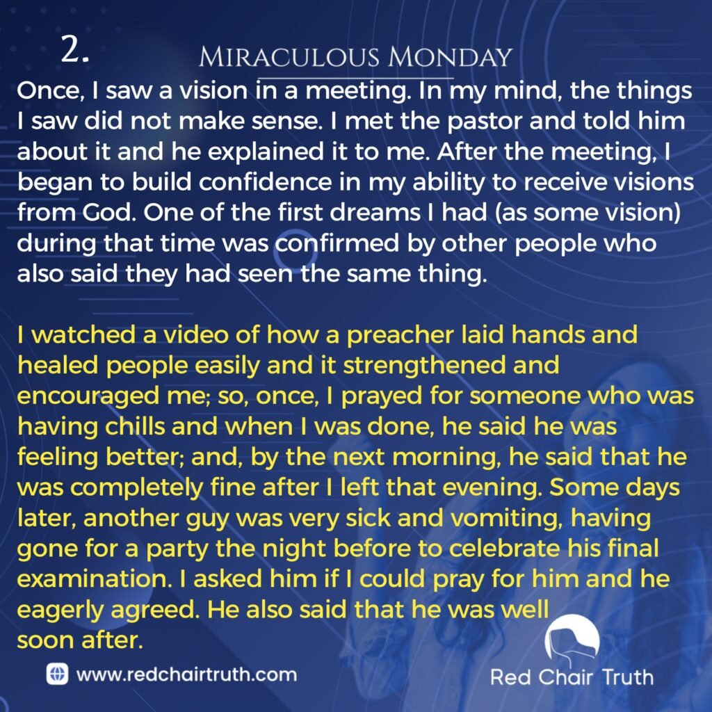 I watched a video of how a preacher laid hands and healed people easily and it strengthened and encouraged me; so, once, I prayed for someone who was having chills and when I was done, he said he was feeling better; and, by the next morning, he said that he was completely fine after I left that evening. Some days later, another guy was very sick and vomiting, having gone for a party the night before to celebrate his final examination. I asked him if I could pray for him and he eagerly agreed. He also said that he was well soon after.
