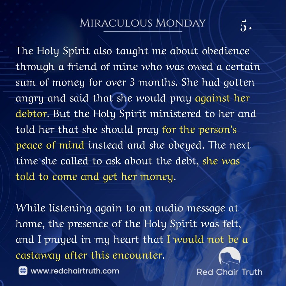 The Holy Spirit also used another friend of mine to teach me about obedience. She had been owed a certain sum of money for over three months and was angry, planning to pray against her debtor. But the Holy Spirit told her instead to pray for the person’s peace of mind — and she obeyed.