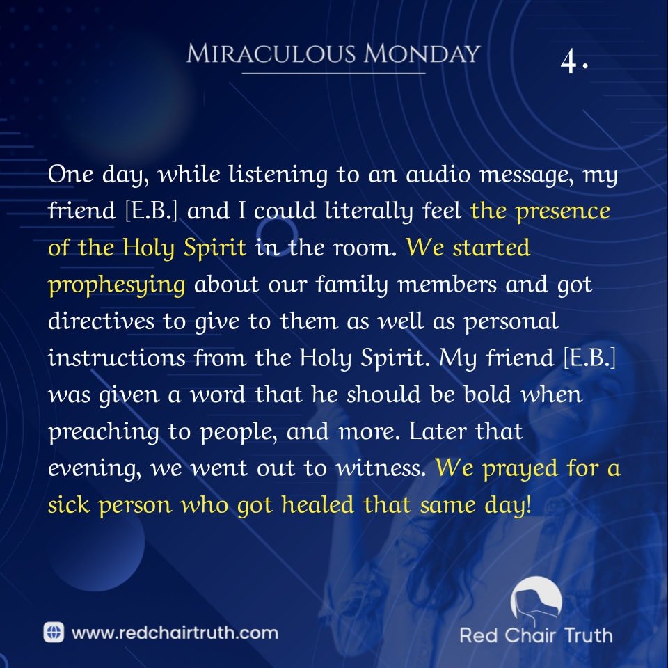 One day, while listening to an audio message with my friend E.B., we literally felt the presence of the Holy Spirit in the room. We began to prophesy about our family members, giving them instructions from the Lord, and even received personal directions ourselves.