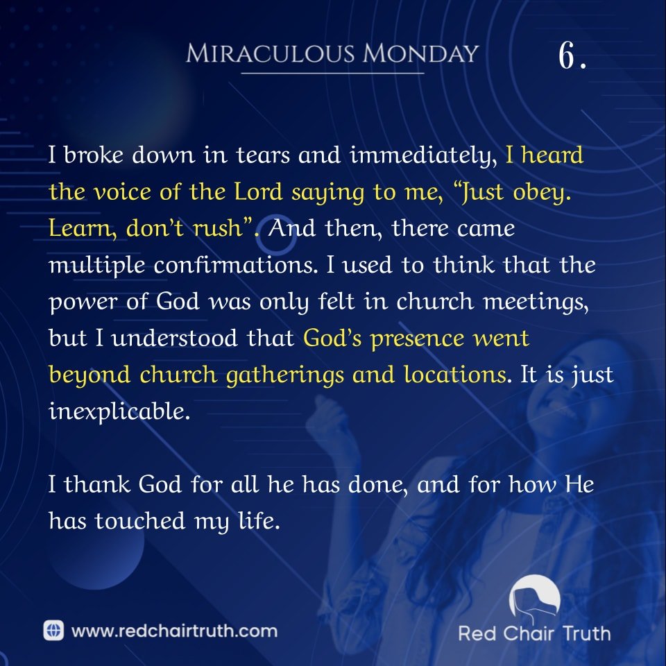 I used to think that the power of God could only be experienced in church meetings, but now I understand that His presence goes beyond any location or gathering. His presence is real and inexplicable.