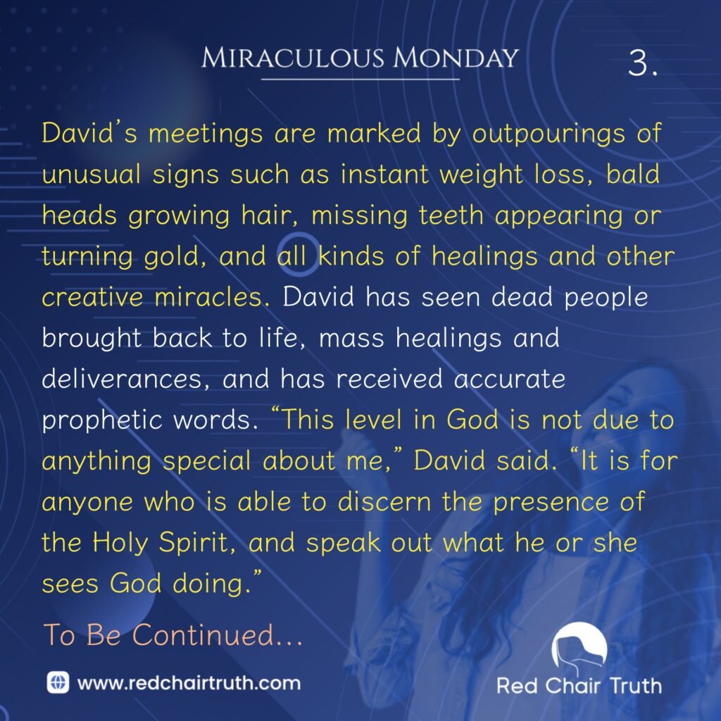 David’s meetings are marked by outpourings of unusual signs such as instant weight loss, bald heads growing hair, missing teeth appearing or turning gold, and all kinds of healings and other creative miracles. David has seen dead people brought back to life, mass healings and deliverances, and has received accurate prophetic words.