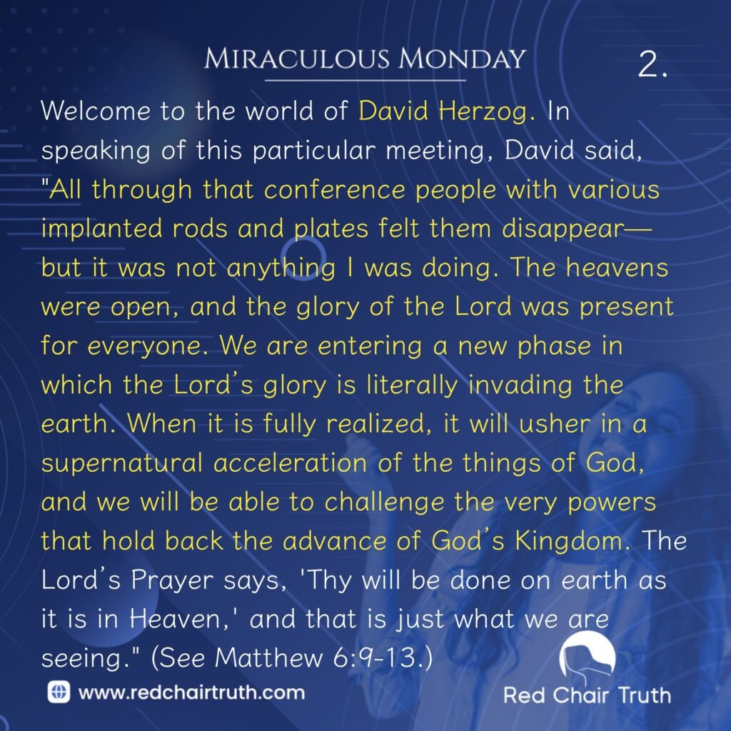 Welcome to the world of David Herzog. In speaking of this particular meeting, David said, “All through that conference people with various implanted rods and plates felt them disappear—but it was not anything I was doing. The heavens were open, and the glory of the Lord was present for everyone. We are entering a new phase in which the Lord’s glory is literally invading the earth. When it is fully realized, it will usher in a supernatural acceleration of the things of God, and we will be able to challenge the very powers that hold back the advance of God’s Kingdom. The Lord’s Prayer says, ‘Thy will be done on earth as it is in Heaven,’ and that is just what we are seeing.” (See Matthew 6:9–13.)