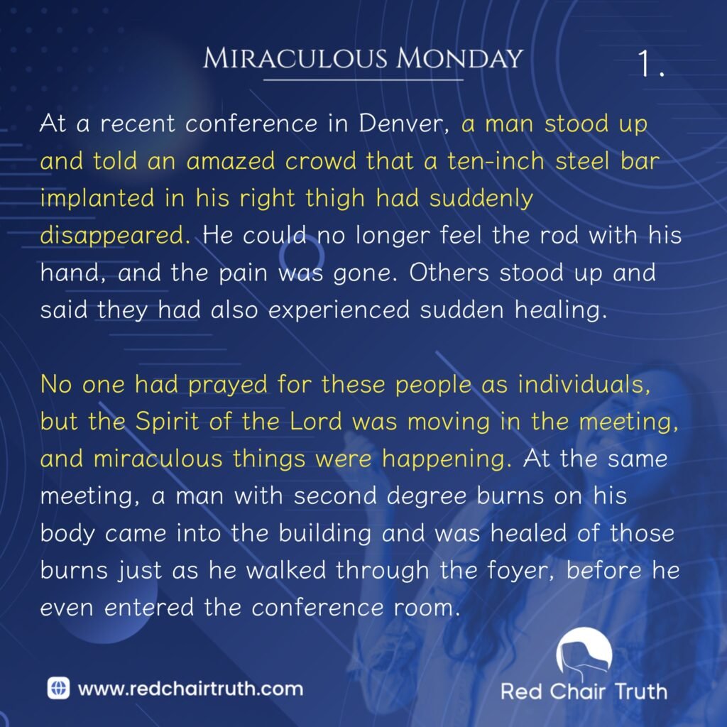 At a recent conference in Denver, a man stood up and told an amazed crowd that a ten-inch steel bar implanted in his right thigh had suddenly disappeared. He could no longer feel the rod with his hand, and the pain was gone. Others stood up and said they had also experienced sudden healing.
