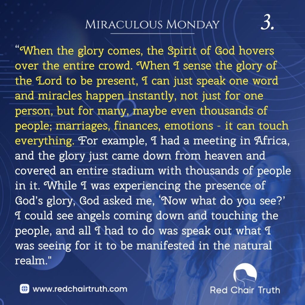 “When the glory comes, the Spirit of God hovers over the entire crowd. When I sense the glory of the Lord to be present, I can just speak one word and miracles happen instantly, not just for one person, but for many, maybe even thousands of people; marriages, finances, emotions – it can touch everything. For example, I had a meeting in Africa, and the glory just came down from heaven and covered an entire stadium with thousands of people in it. While I was experiencing the presence of God’s glory, God asked me, ‘Now what do you see?’ I could see angels coming down and touching the people, and all I had to do was speak out what I was seeing for it to be manifested in the natural realm.”