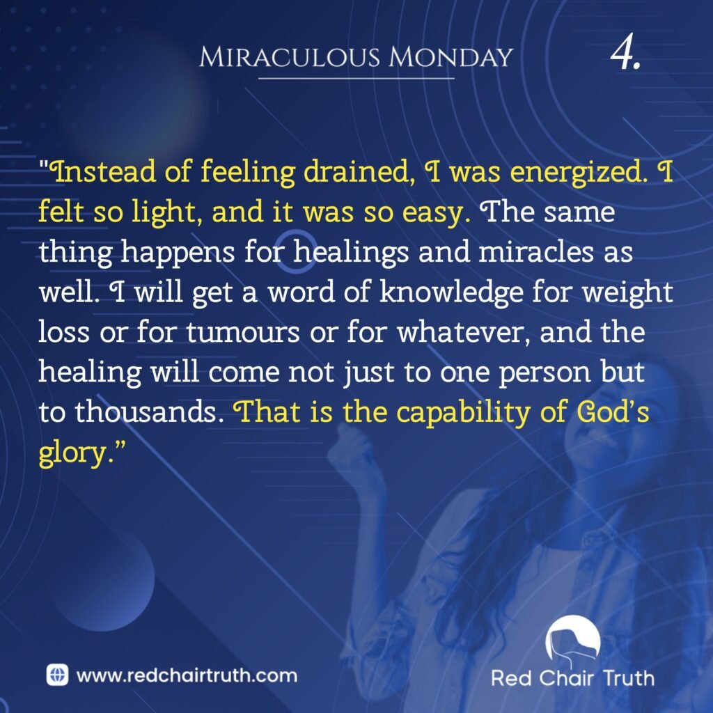 “Instead of feeling drained, I was energized. I felt so light, and it was so easy. The same thing happens for healings and miracles as well. I will get a word of knowledge for weight loss or for tumours or for whatever, and the healing will come not just to one person but to thousands. That is the capability of God’s glory.”