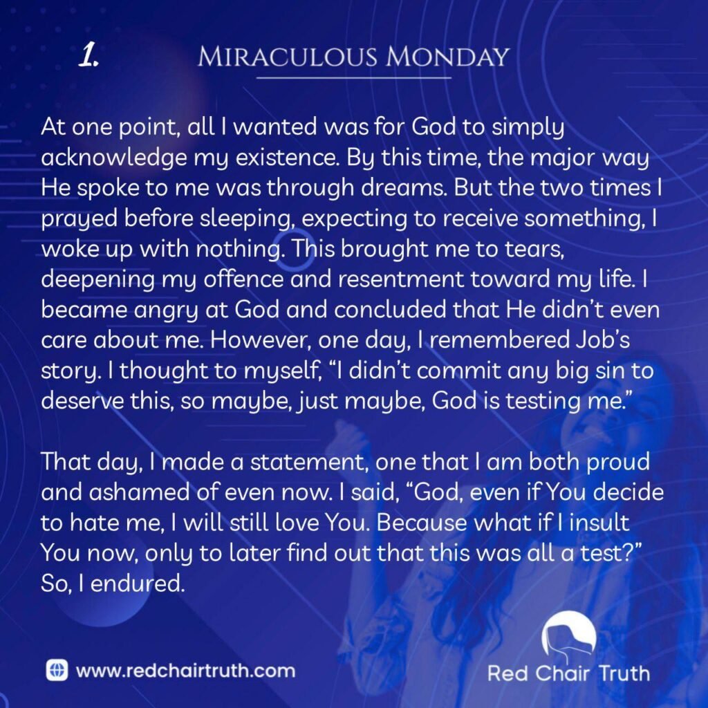 At one point, all I wanted was for God to simply acknowledge my existence. By this time, the major way He spoke to me was through dreams. But the two times I prayed before sleeping, expecting to receive something, I woke up with nothing. This brought me to tears, deepening my offence and resentment toward my life. I became angry at God and concluded that He didn’t even care about me. However, one day, I remembered Job’s story. I thought to myself, “I didn’t commit any big sin to deserve this, so maybe, just maybe, God is testing me.”