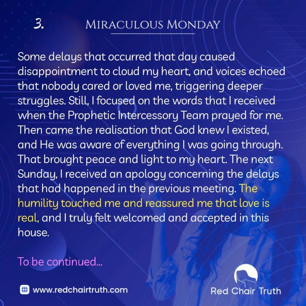 Some delays that occurred that day caused disappointment to cloud my heart, and voices echoed that nobody cared or loved me, triggering deeper struggles. Still, I focused on the words that I received when the Prophetic Intercessory Team prayed for me. Then came the realisation that God knew I existed, and He was aware of everything I was going through. That brought peace and light to my heart. The next Sunday, I received an apology concerning the delays that had happened in the previous meeting. The humility touched me and reassured me that love is real, and I truly felt welcomed and accepted in this house.