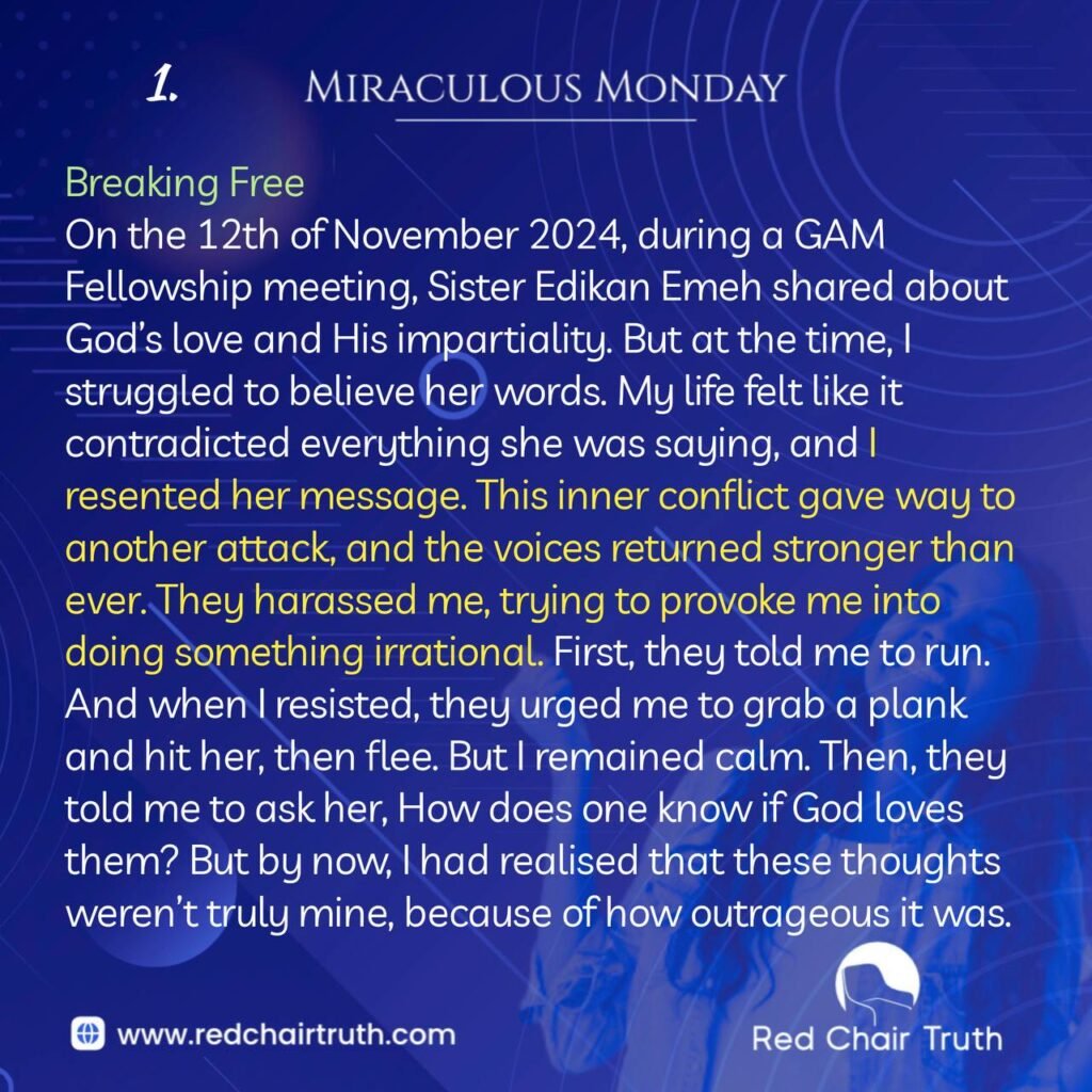 On the 12th of November 2024, during a GAM Fellowship meeting, Sister Edikan Emeh shared about God’s love and His impartiality. But at the time, I struggled to believe her words. My life felt like it contradicted everything she was saying, and I resented her message. This inner conflict gave way to another attack, and the voices returned stronger than ever. They harassed me, trying to provoke me into doing something irrational. First, they told me to run. And when I resisted, they urged me to grab a plank and hit her, then flee. But I remained calm. Then, they told me to ask her, How does one know if God loves them? But by now, I had realised that these thoughts weren’t truly mine, because of how outrageous it was.