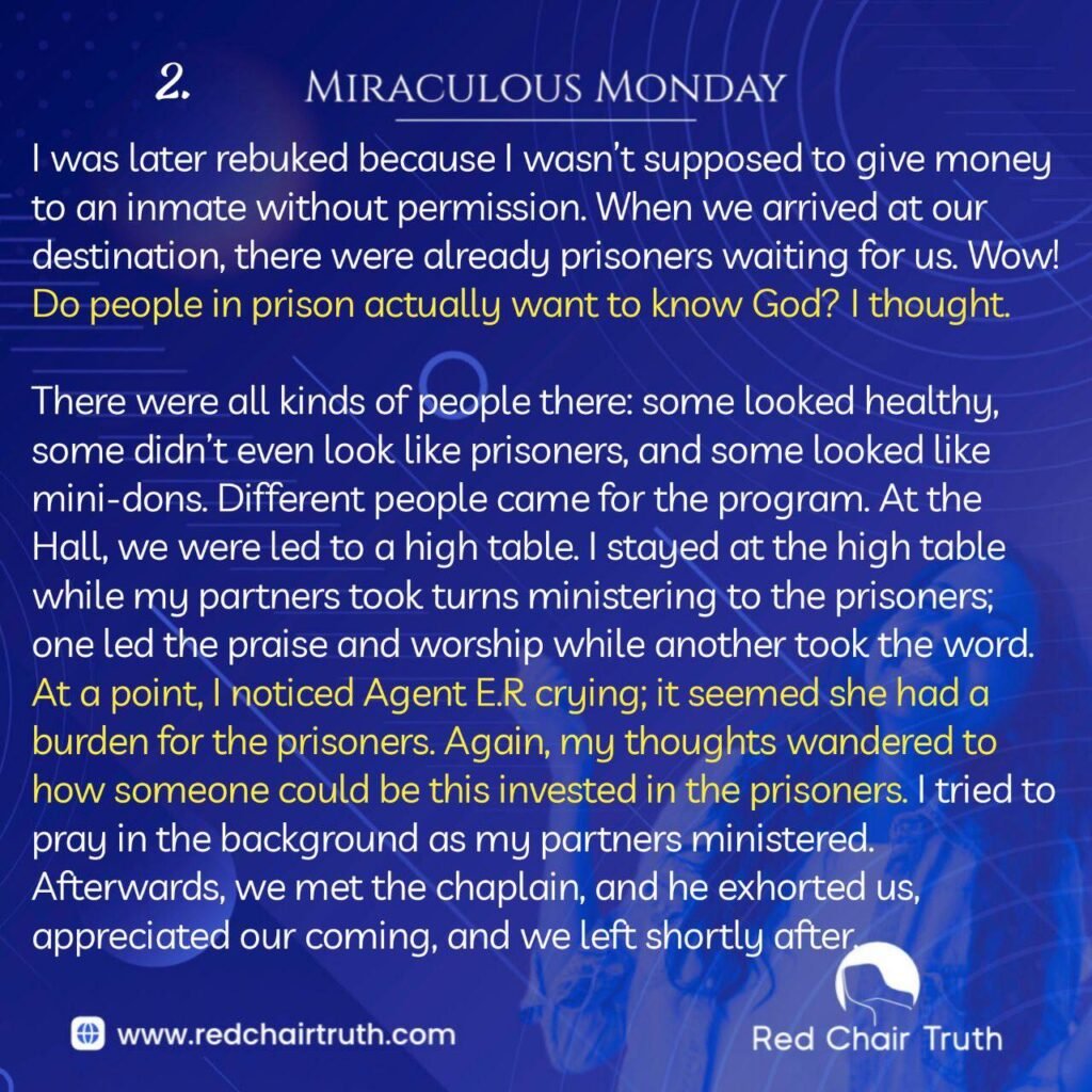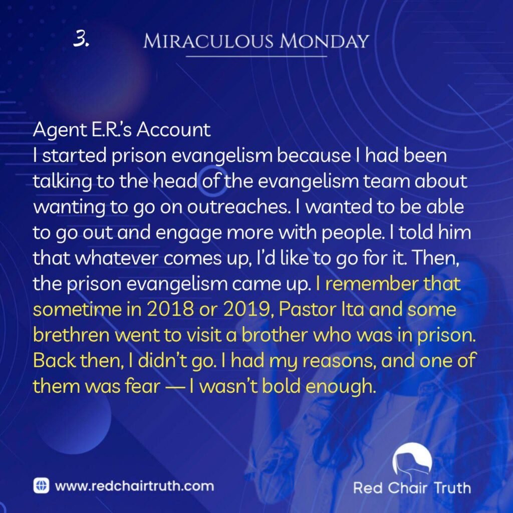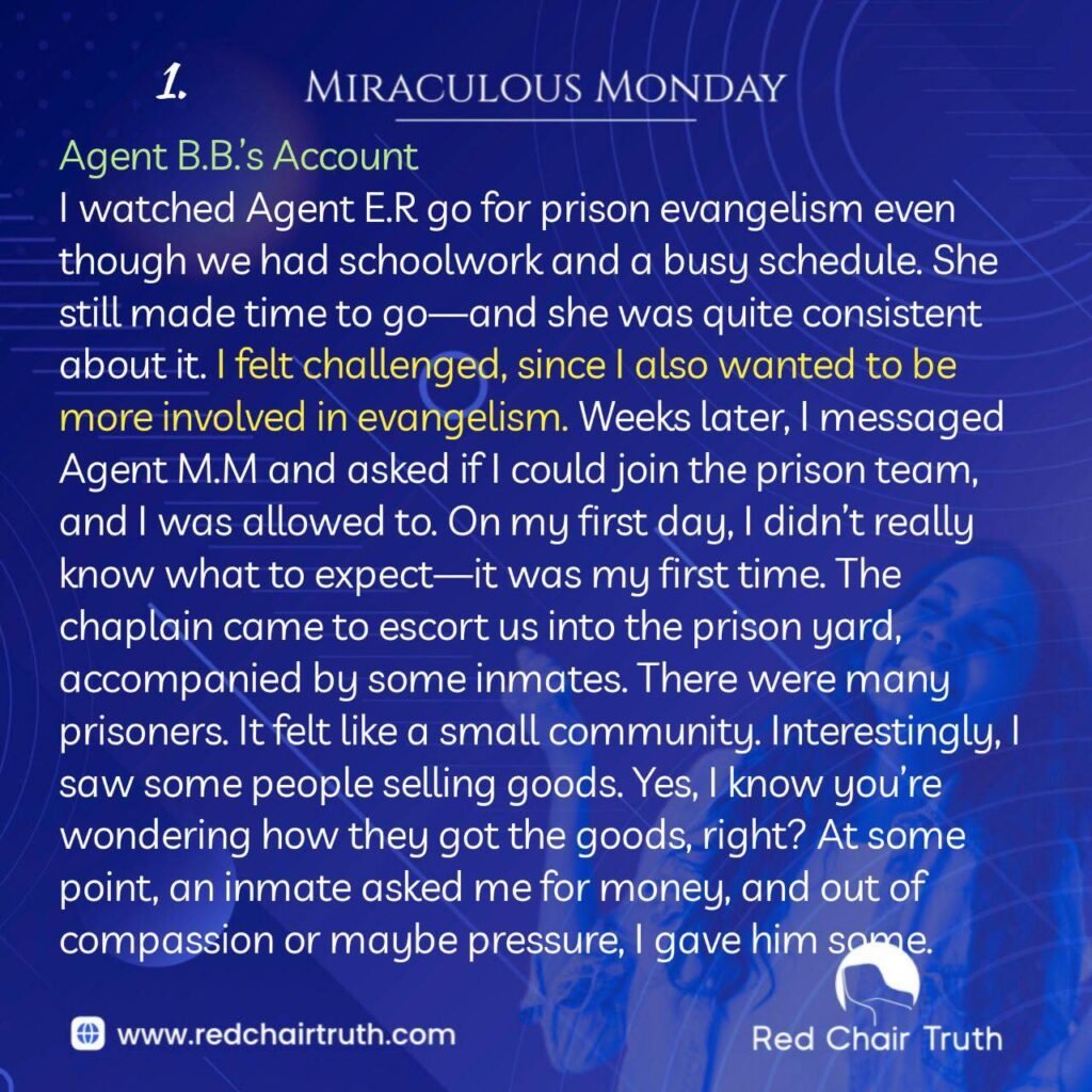 I watched Agent E.R go for prison evangelism even though we had schoolwork and a busy schedule. She still made time to go-and she was quite consistent about it. I felt challenged, since I also wanted to be more involved in evangelism. Weeks later, I messaged Agent M.M and asked if I could join the prison team, and I was allowed to. On my first day, I didn’t really know what to expect-it was my first time. The chaplain came to escort us into the prison yard, accompanied by some inmates. There were many prisoners. It felt like a small community. Interestingly, I saw some people selling goods. Yes, I know you’re wondering how they got the goods, right? At some point, an inmate asked me for money, and out of compassion or maybe pressure, I gave him some.