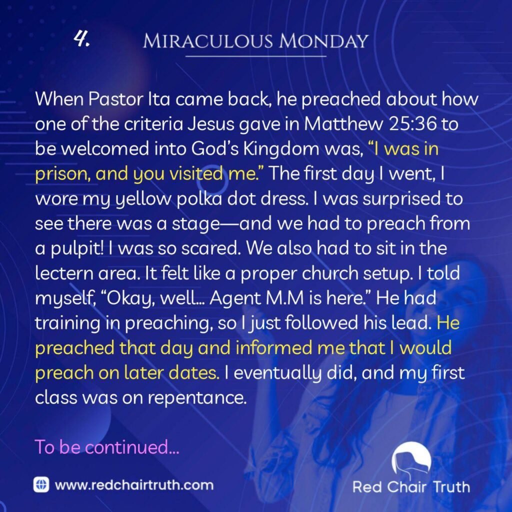When Pastor Ita came back, he preached about how one of the criteria Jesus gave in Matthew 25:36 to be welcomed into God’s Kingdom was, “I was in prison, and you visited me.” The first day I went, I wore my yellow polka dot dress. I was surprised to see there was a stage-and we had to preach from a pulpit! I was so scared. We also had to sit in the lectern area. It felt like a proper church setup. I told myself, “Okay, well… Agent M.M is here.” He had training in preaching, so I just followed his lead. He preached that day and informed me that I would preach on later dates. I eventually did, and my first class was on repentance.