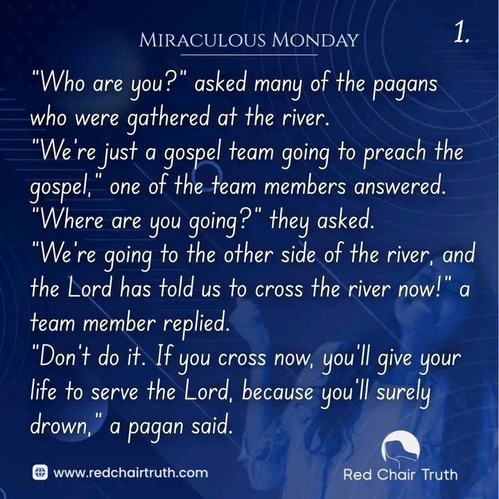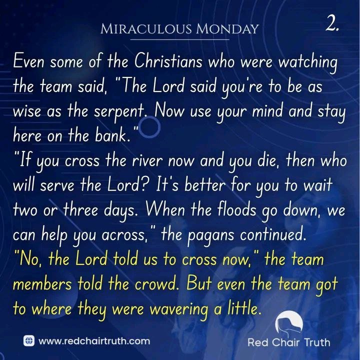 Even some of the Christians who were watching the team said, “The Lord said you’re to be as wise as the serpent. Now use your mind and stay here on the bank.” “If you cross the river now and you die, then who will serve the Lord? It’s better for you to wait two or three days. When the floods go down, we can help you across,” the pagans continued.