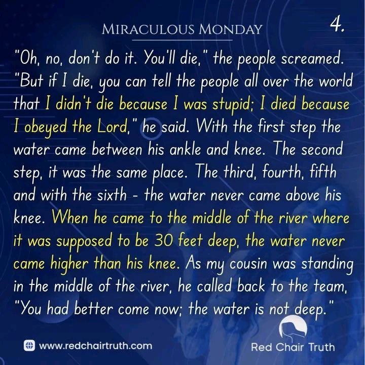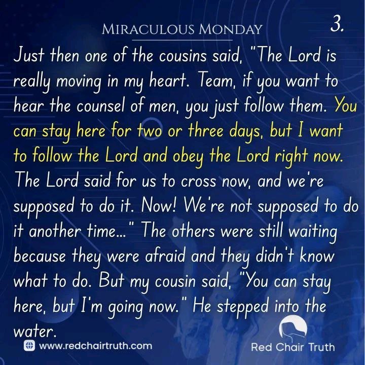 With the first step the water came between his ankle and knee. The second step, it was the same place. The third, fourth, fifth and with the sixth – the water never came above his knee. When he came to the middle of the river where it was supposed to be 30 feet deep, the water never came higher than his knee. As my cousin was standing in the middle of the river, he called back to the team
