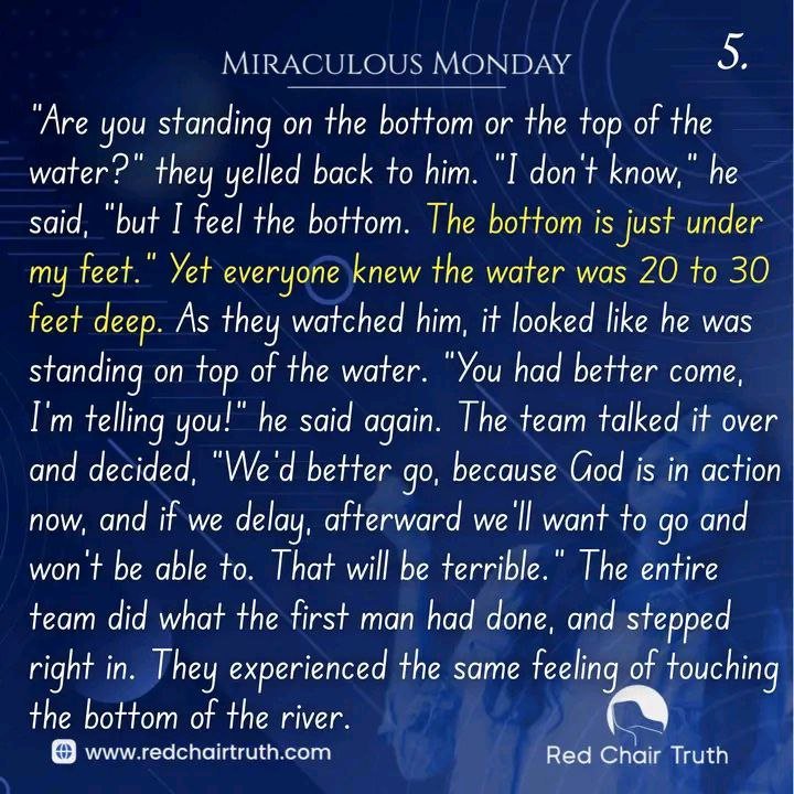 “Are you standing on the bottom or the top of the water?” they yelled back to him. “I don’t know,” he said, “but I feel the bottom. The bottom is just under my feet.” Yet everyone knew the water was 20 to 30 feet deep. As they watched him, it looked like he was standing on top of the water. “You had better come, I’m telling you!” he said again.
