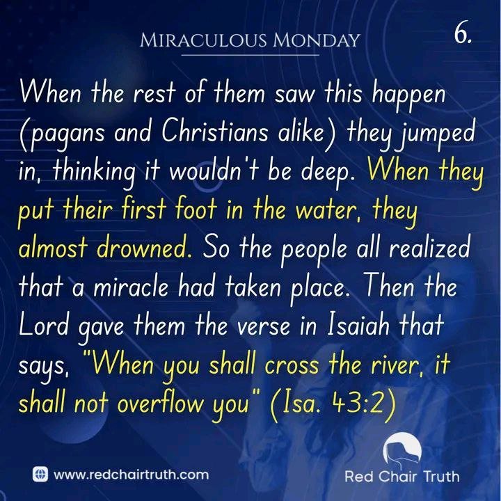 When the rest of them saw this happen (pagans and Christians alike) they jumped in, thinking it wouldn’t be deep. When they put their first foot in the water, they almost drowned. So the people all realized that a miracle had taken place. Then the Lord gave them the verse in Isaiah that says, “When you shall cross the river, it shall not overflow you” (Isa. 43:2).