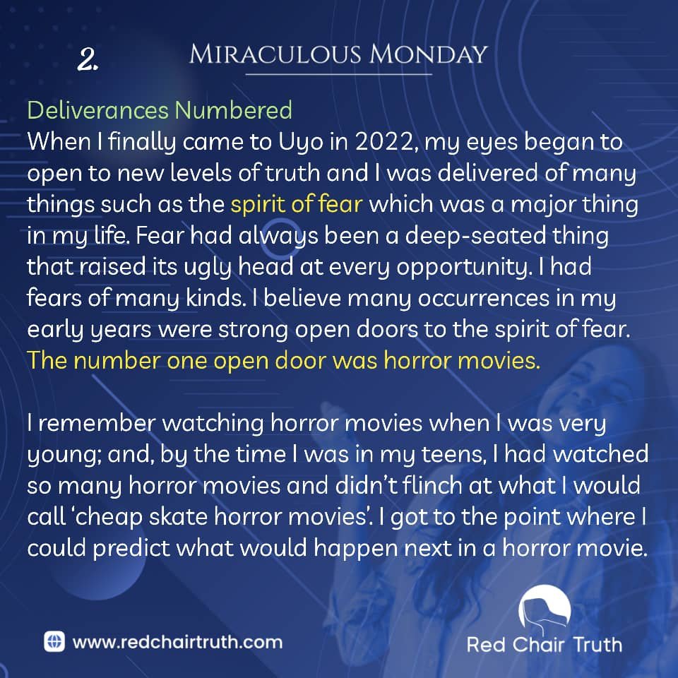 When I finally came to Uyo in 2022, my eyes began to open to new levels of truth and I was delivered of many things such as the spirit of fear which was a major thing in my life. Fear had always been a deep-seated thing that raised its ugly head at every opportunity. I had fears of many kinds. I believe many occurrences in my early years were strong open doors to the spirit of fear.