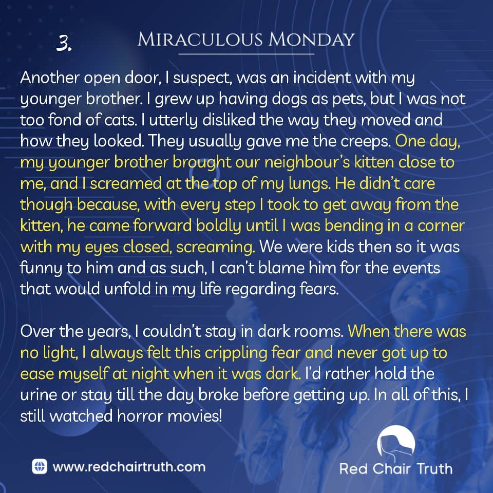 Another open door, I suspect, was an incident with my younger brother. I grew up having dogs as pets, but I was not too fond of cats. I utterly disliked the way they moved and how they looked. They usually gave me the creeps. One day, my younger brother brought our neighbour’s kitten close to me, and I screamed at the top of my lungs. He didn’t care though because, with every step I took to get away from the kitten, he came forward boldly until I was bending in a corner with my eyes closed, screaming. We were kids then so it was funny to him and as such, I can’t blame him for the events that would unfold in my life regarding fears.