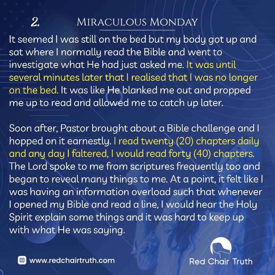 Soon after, Pastor brought about a Bible challenge and I hopped on it earnestly. I read twenty (20) chapters daily and any day I faltered, I would read forty (40) chapters. The Lord spoke to me from scriptures frequently too and began to reveal many things to me. At a point, it felt like I was having an information overload such that whenever I opened my Bible and read a line, I would hear the Holy Spirit explain some things and it was hard to keep up with what He was saying.