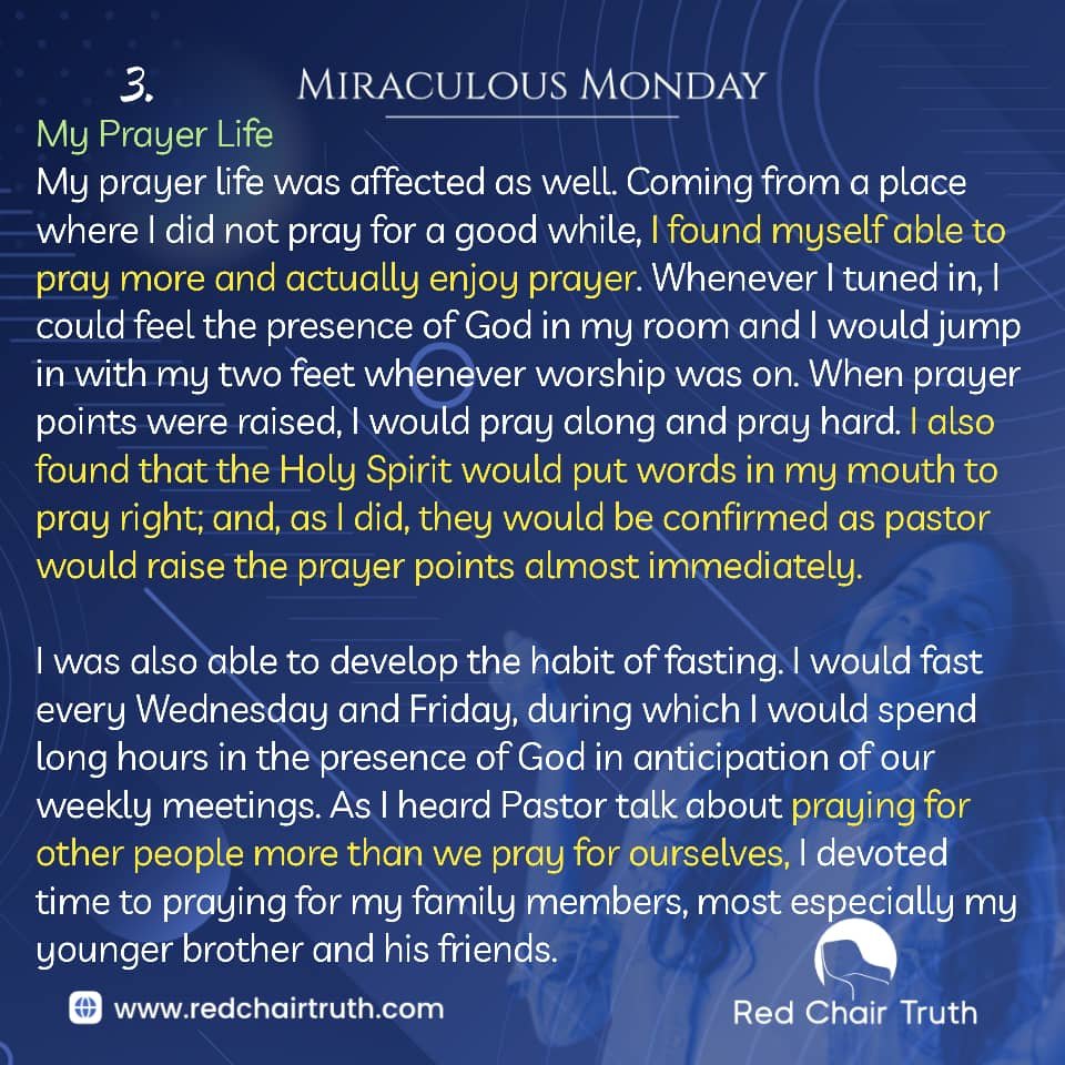 My prayer life was affected as well. Coming from a place where I did not pray for a good while, I found myself able to pray more and actually enjoy prayer. Whenever I tuned in, I could feel the presence of God in my room and I would jump in with my two feet whenever worship was on. When prayer points were raised, I would pray along and pray hard. I also found that the Holy Spirit would put words in my mouth to pray right; and, as I did, they would be confirmed as pastor would raise the prayer points almost immediately.