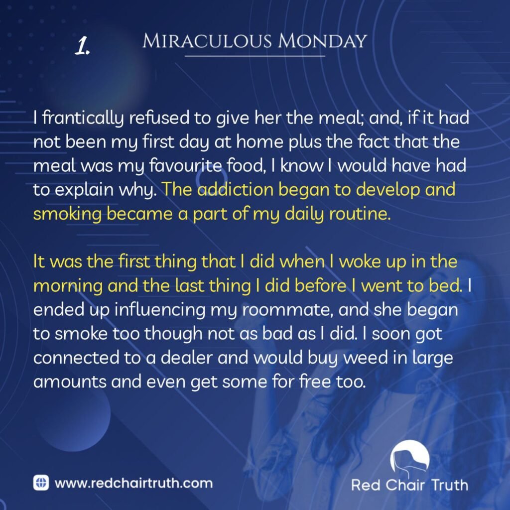 It was the first thing that I did when I woke up in the morning and the last thing I did before I went to bed. I ended up influencing my roommate, and she began to smoke too though not as bad as I did. I soon got connected to a dealer and would buy weed in large amounts and even get some for free too.