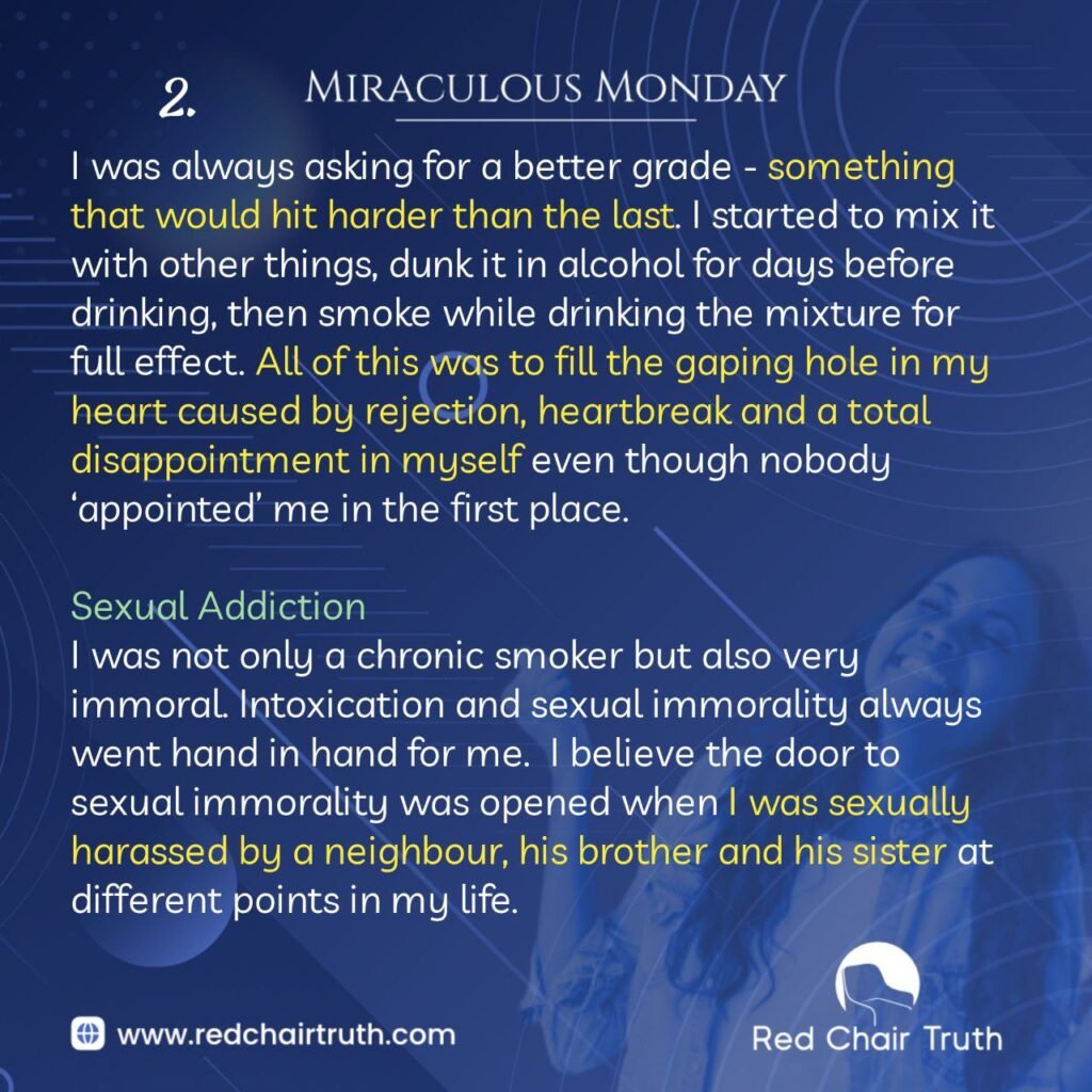 I was not only a chronic smoker but also very immoral. Intoxication and sexual immorality always went hand in hand for me. I believe the door to sexual immorality was opened when I was sexually harassed by a neighbour, his brother and his sister at different points in my life.