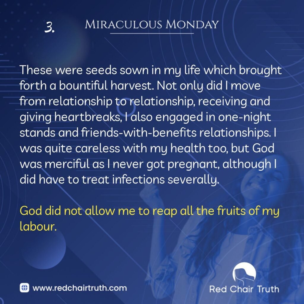 These were seeds sown in my life which brought forth a bountiful harvest. Not only did I move from relationship to relationship, receiving and giving heartbreaks, I also engaged in one-night stands and friends-with-benefits relationships. I was quite careless with my health too, but God was merciful as I never got pregnant, although I did have to treat infections severally.
