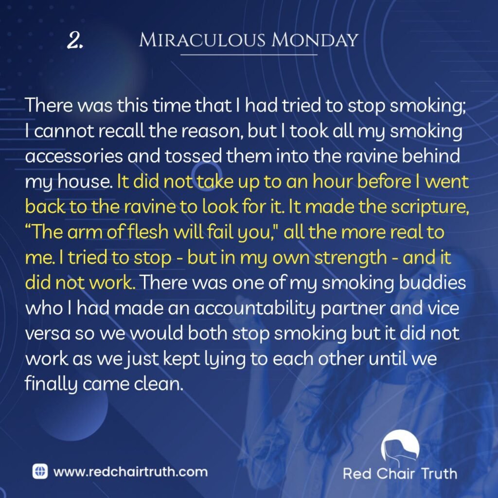 There was this time that I had tried to stop smoking; I cannot recall the reason, but I took all my smoking accessories and tossed them into the ravine behind my house. It did not take up to an hour before I went back to the ravine to look for it. It made the scripture, “The arm of flesh will fail you,” all the more real to me. I tried to stop – but in my own strength – and it did not work. There was one of my smoking buddies who I had made an accountability partner and vice versa so we would both stop smoking but it did not work as we just kept lying to each other until we finally came clean.