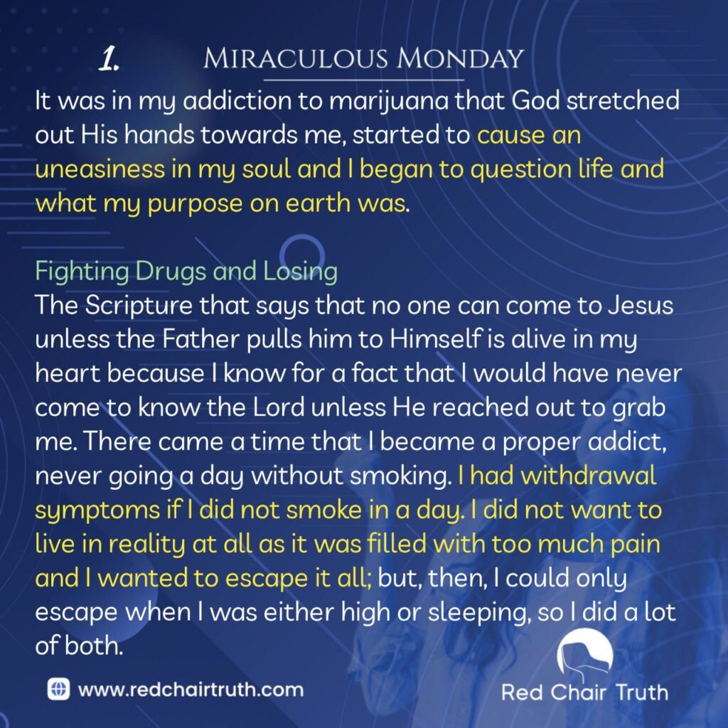 It was in my addiction to marijuana that God stretched out His hands towards me, started to cause an uneasiness in my soul and I began to question life and what my purpose on earth was.