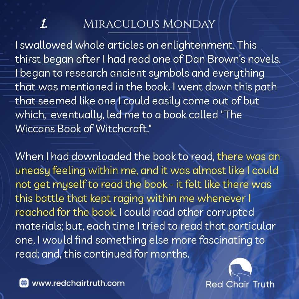 I swallowed whole articles on enlightenment. This thirst began after I had read one of Dan Brown’s novels. I began to research ancient symbols and everything that was mentioned in the book. I went down this path that seemed like one I could easily come out of but which, eventually, led me to a book called “The Wiccans Book of Witchcraft.”