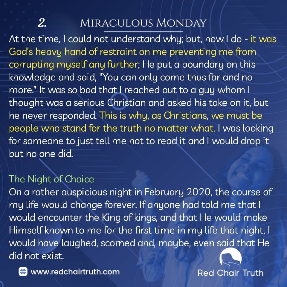 At the time, I could not understand why; but, now I do – it was God’s heavy hand of restraint on me preventing me from corrupting myself any further; He put a boundary on this knowledge and said, “You can only come thus far and no more.” It was so bad that I reached out to a guy whom l thought was a serious Christian and asked his take on it, but he never responded. This is why, as Christians, we must be people who stand for the truth no matter what. I was looking for someone to just tell me not to read it and I would drop it but no one did.