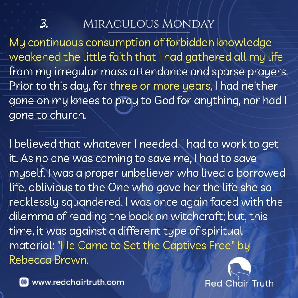 I believed that whatever I needed, I had to work to get it. As no one was coming to save me, I had to save myself. I was a proper unbeliever who lived a borrowed life, oblivious to the One who gave her the life she so recklessly squandered. I was once again faced with the dilemma of reading the book on witchcraft; but, this time, it was against a different type of spiritual material: “He Came to Set the Captives Free” by Rebecca Brown.