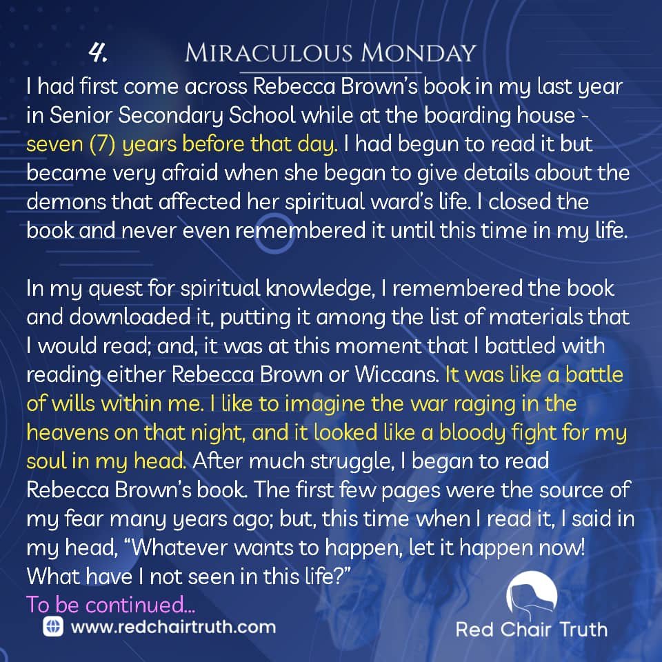 In my quest for spiritual knowledge, I remembered the book and downloaded it, putting it among the list of materials that I would read; and, it was at this moment that I battled with reading either Rebecca Brown or Wiccans. It was like a battle of wills within me. I like to imagine the war raging in the heavens on that night, and it looked like a bloody fight for my soul in my head. After much struggle, I began to read Rebecca Brown’s book. The first few pages were the source of my fear many years ago; but, this time when I read it, I said in my head, “Whatever wants to happen, let it happen now! What have I not seen in this life?”