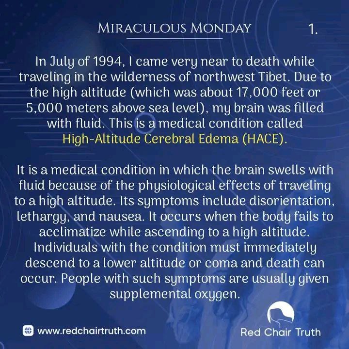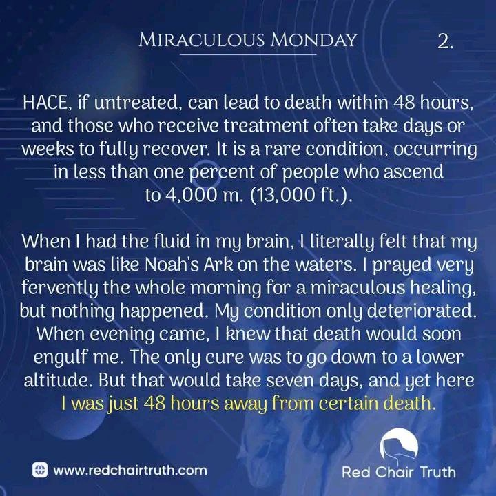 HACE, if untreated, can lead to death within 48 hours, and those who receive treatment often take days or weeks to fully recover. It is a rare condition, occurring in less than one percent of people who ascend to 4,000 m. (13,000 ft.). When I had the fluid in my brain, I literally felt that my brain was like Noah’s Ark on the waters. I prayed very fervently the whole morning for a miraculous healing, but nothing happened. My condition only deteriorated. When evening came, I knew that death would soon engulf me. The only cure was to go down to a lower altitude. But that would take seven days, and yet here I was just 48 hours away from certain death.
