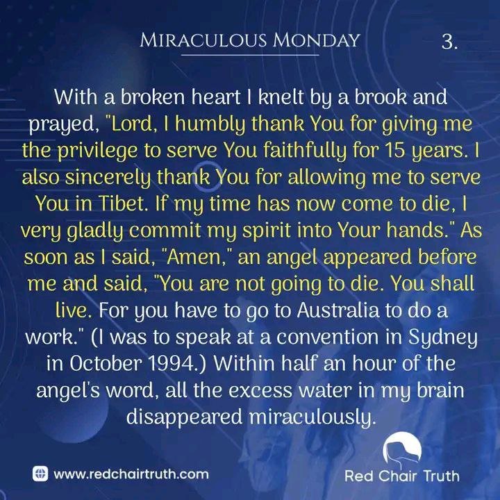 With a broken heart I knelt by a brook and prayed, “Lord, I humbly thank You for giving me the privilege to serve You faithfully for 15 years. I also sincerely thank You for allowing me to serve You in Tibet. If my time has now come to die, I very gladly commit my spirit into Your hands.” As soon as I said, “Amen,” an angel appeared before me and said, “You are not going to die. You shall live. For you have to go to Australia to do a work.” (I was to speak at a convention in Sydney in October 1994.) Within half an hour of the angel’s word, all the excess water in my brain disappeared miraculously.
