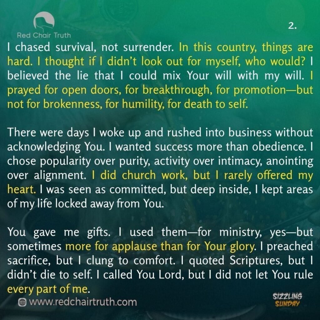 There were days I woke up and rushed into business without acknowledging You. I wanted success more than obedience. I chose popularity over purity, activity over intimacy, anointing over alignment. I did church work, but I rarely offered my heart. I was seen as committed, but deep inside, I kept areas of my life locked away from You. You gave me gifts. I used them-for ministry, yes-but sometimes more for applause than for Your glory. I preached sacrifice, but I clung to comfort. I quoted Scriptures, but I didn’t die to self. I called You Lord, but I did not let You rule every part of me.