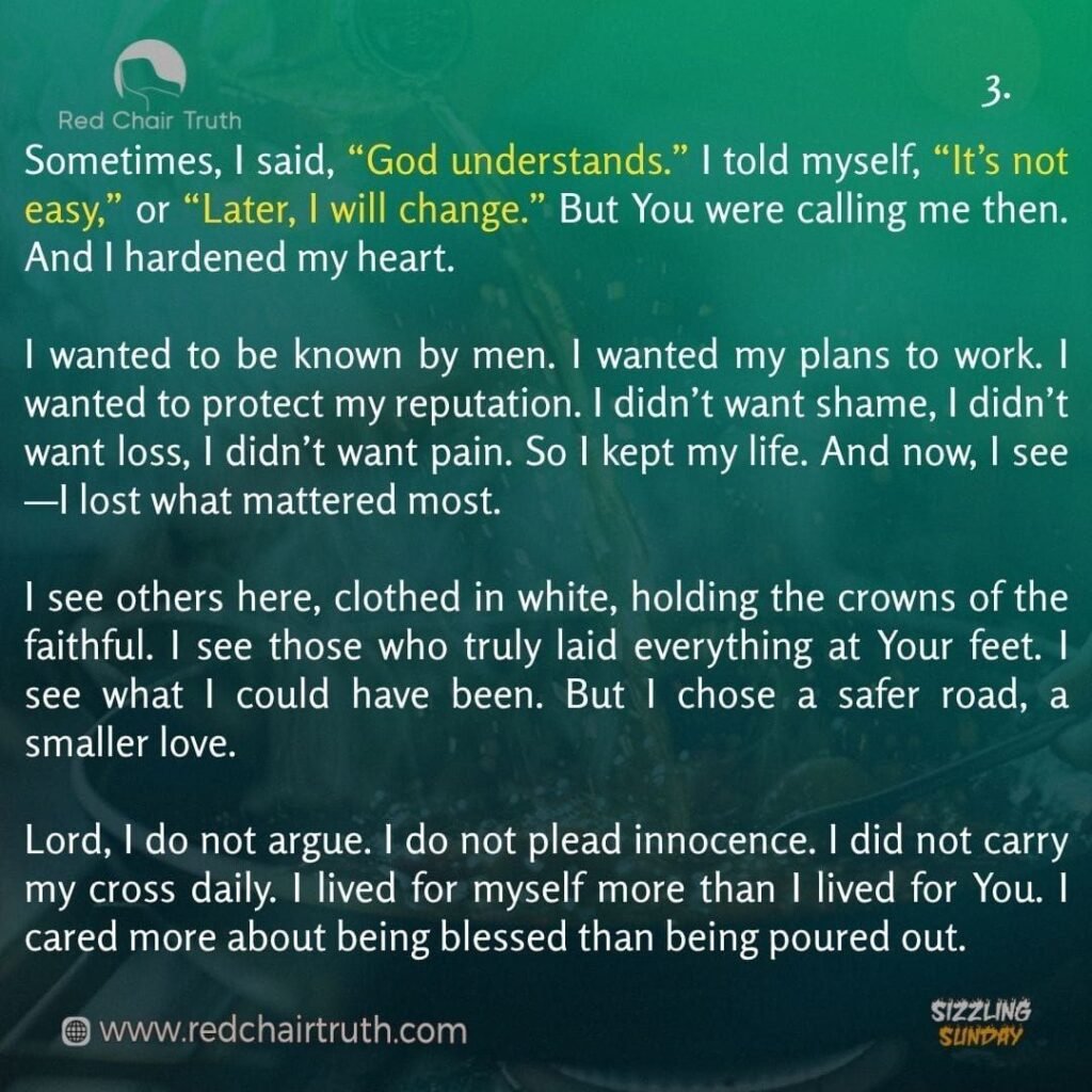 Sometimes, I said, “God understands.” I told myself, “It’s not easy,” or “Later, I will change.” But You were calling me then. And I hardened my heart. I wanted to be known by men. I wanted my plans to work. I wanted to protect my reputation. I didn’t want shame, I didn’t want loss, I didn’t want pain. So I kept my life. And now, I see -I lost what mattered most. I see others here, clothed in white, holding the crowns of the faithful. I see those who truly laid everything at Your feet. I see what I could have been. But I chose a safer road, a smaller love. Lord, I do not argue. I do not plead innocence. I did not carry my cross daily. I lived for myself more than I lived for You. I cared more about being blessed than being poured out. And now, with tears in my eyes, I confess-You were always worthy of my all. I gave You pieces.
