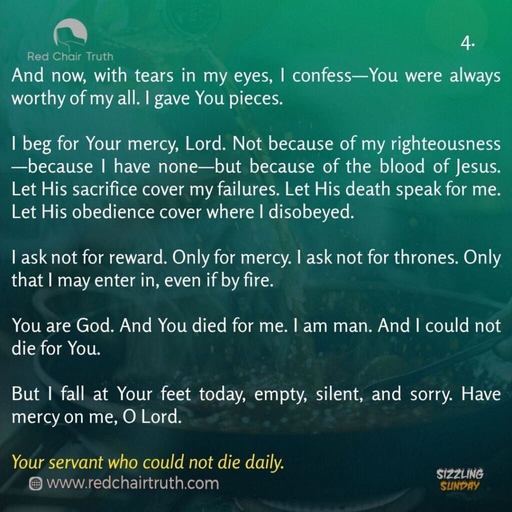 I beg for Your mercy, Lord. Not because of my righteousness -because I have none-but because of the blood of Jesus. Let His sacrifice cover my failures. Let His death speak for me. Let His obedience cover where I disobeyed. I ask not for reward. Only for mercy. I ask not for thrones. Only that I may enter in, even if by fire. You are God. And You died for me. I am man. And I could not die for You. But I fall at Your feet today, empty, silent, and sorry. Have mercy on me, O Lord.