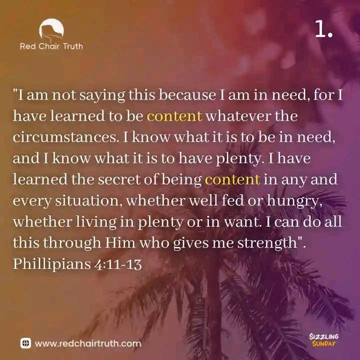 "I am not saying this because I am in need, for I have learned to be content whatever the circumstances. I know what it is to be in need, and I know what it is to have plenty. I have learned the secret of being content in any and every situation, whether well fed or hungry, whether living in plenty or in want. I can do all this through Him who gives me strength". Philippians 4:11-13