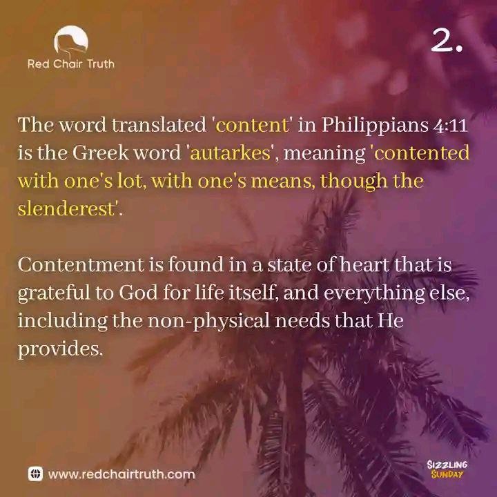 The word translated ‘content‘ in Philippians 4:11 is the Greek word ‘autarkes‘, meaning ‘contented with one’s lot, with one’s means, though the slenderest’.